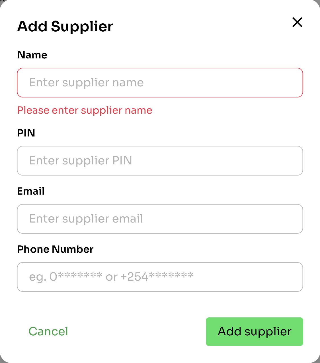 Add a supplier providing the required fields: PIN, Name, and Phone number. Email address is optional.