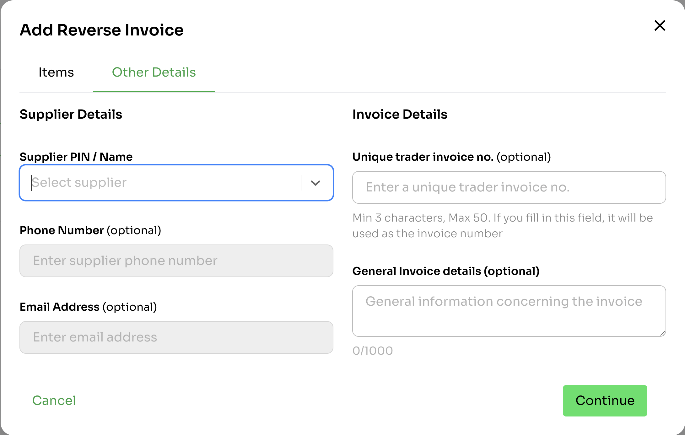 Select Supplier and optionally fill the other fields before clicking "Continue". After confirming the details on the review screen, click "Save" to create the reverse invoice.