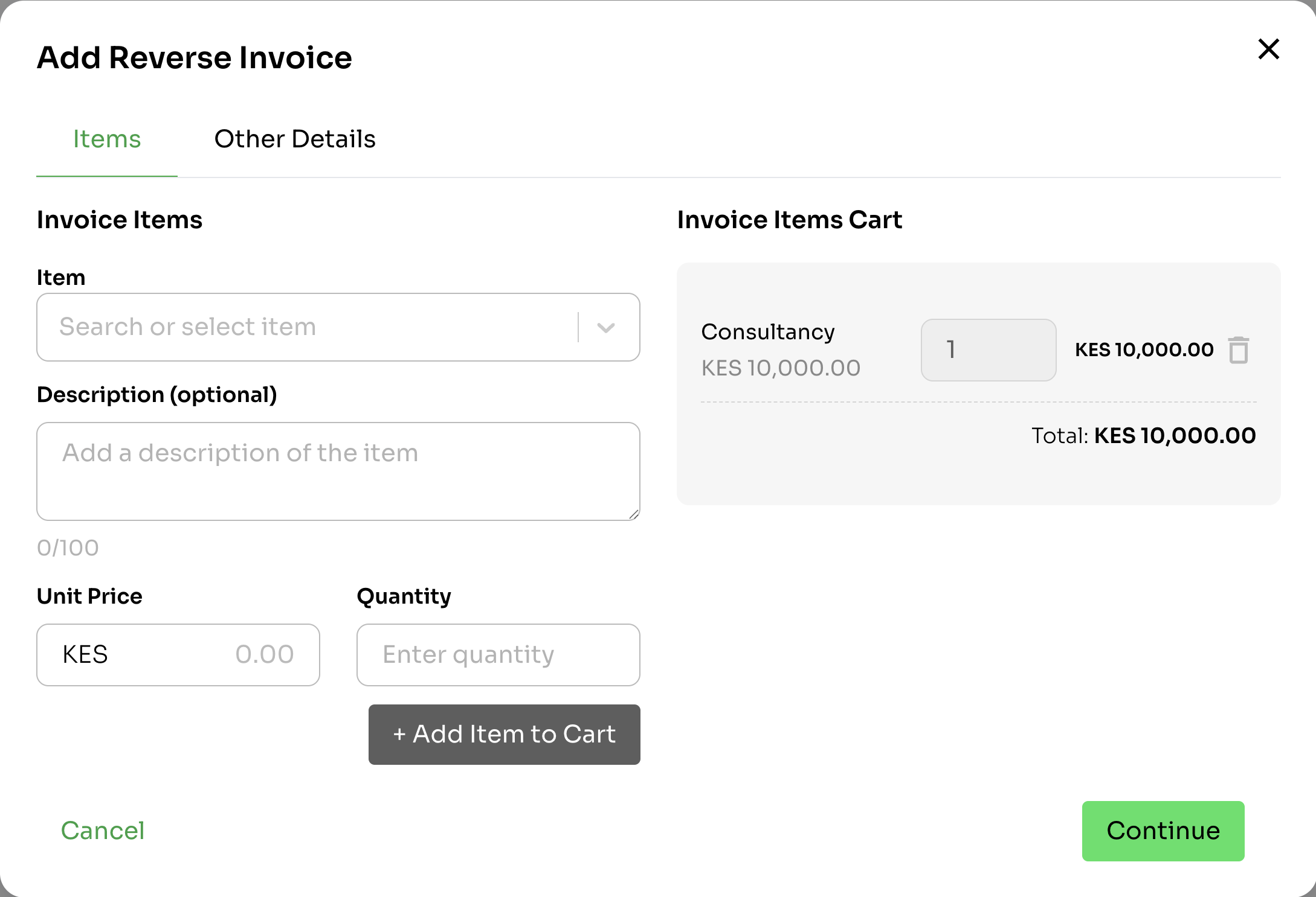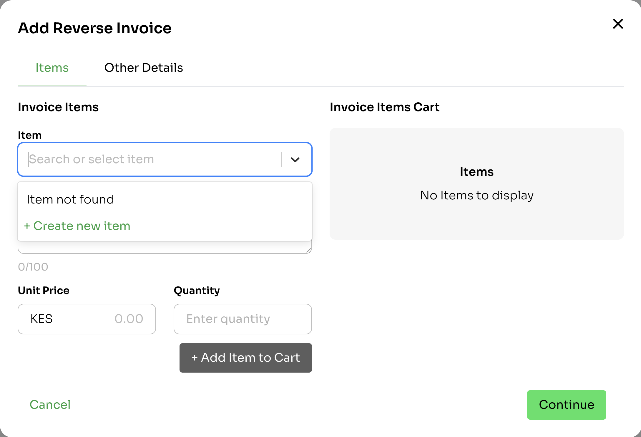 Once item is saved, select item, specify unit price and quantity, then click "+Add Item to Cart". Add more items, if applicable, then click "Continue"